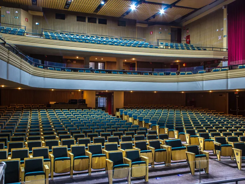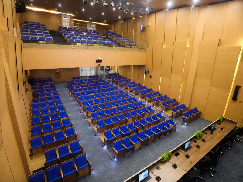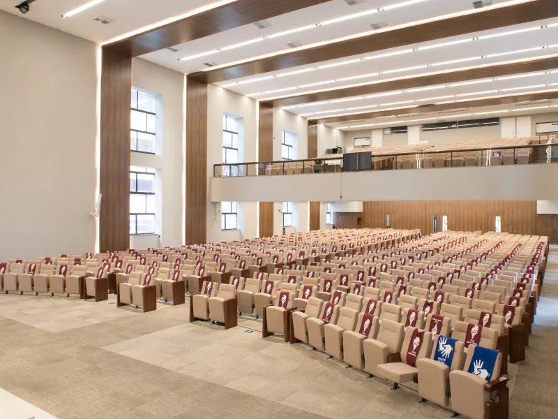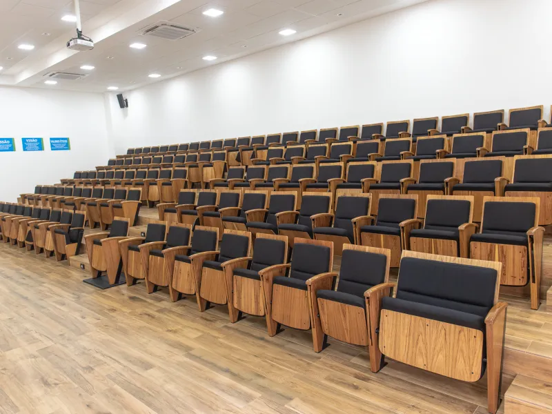 Poltronas estofadas com encosto alto, braços anatômicos e assento rebatível. Ideal para auditórios corporativos e universidades.